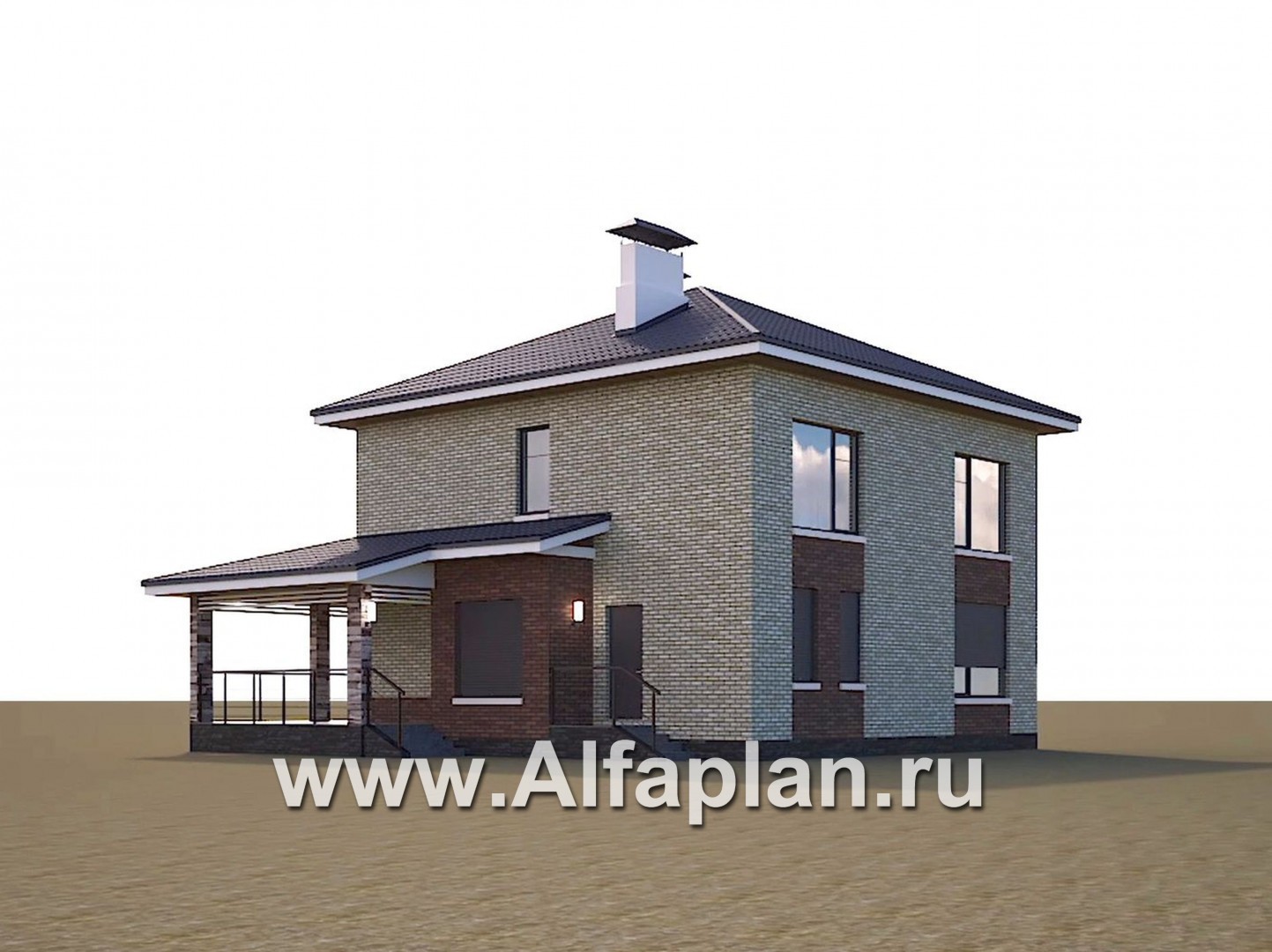 695A-R-S «Роман с камнем» — проект двухэтажного дома, с террасой, со скрытой установкой ролет на окнах 1-го этажа