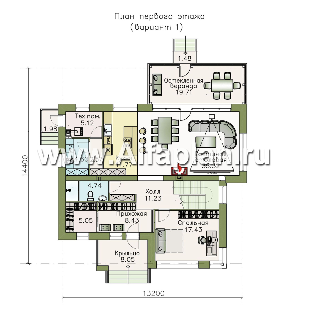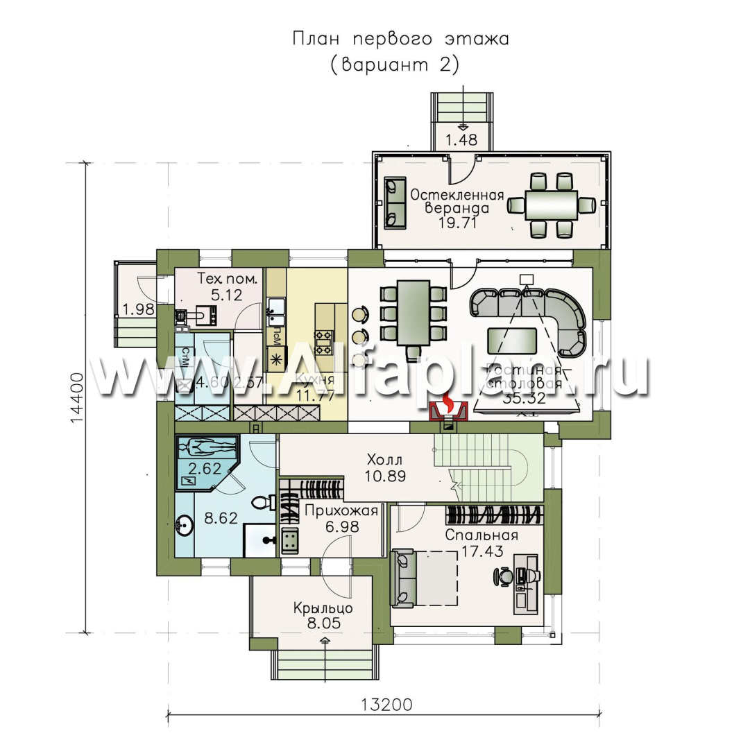 Планировка дома очень рациональна. На входе в дом – большая прихожая, с отдельным, закрытым гардеробом площадью 5м2. Из прихожей попадаешь в холл с лестницей на второй этаж, и широким проемом в гостиную. Гостиная-столовая-кухня – одно помещение, с панорамным остеклением и выходом на прилегающую террасу. Позади кухни находятся постирочная и техническое помещение. На первом этаже есть также кабинет (гостевая) 17м2. Есть вариант планировки первого этажа с сауной.