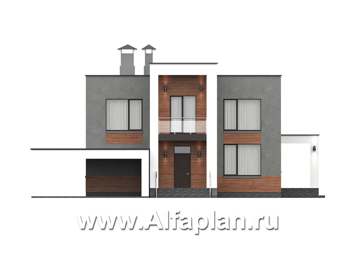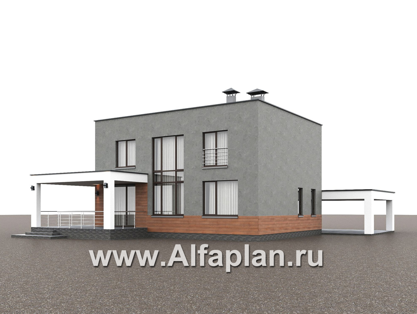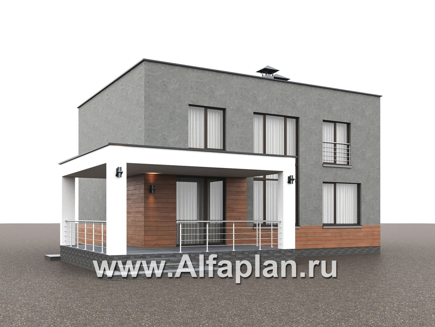 «Вермеер» - проект двухэтажного дома, планировка с мастер спальней, со вторым светом и с террасой, в стиле минимализм с плоской крышей