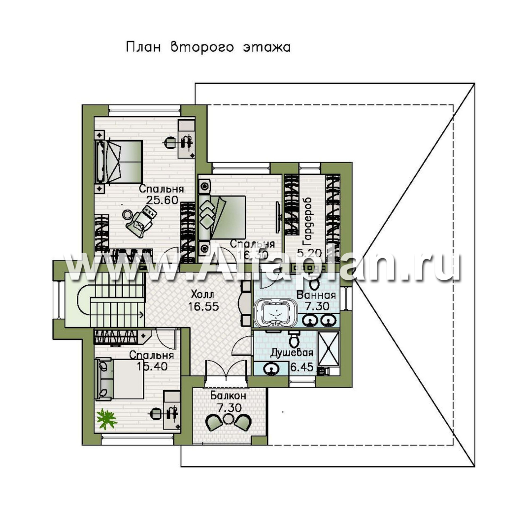 Второй этаж предназначен для владельцев дома — здесь три спальни 22, 27 и 15 м². Все комнаты выходят в общий холл. Рядом с ним раздельные ванная и душевая комнаты. Завершает планировку второго этажа балкон 7 м² — его можно сделать открытым или закрытым, чтобы наслаждаться видом и зимой.