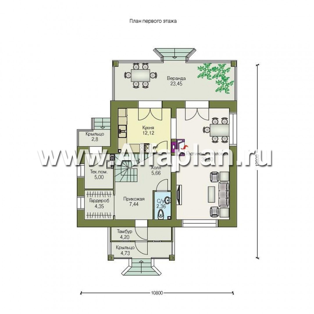 Поднявшись на небольшое крыльцо, через входную дверь мы попадаем в вытянутый тамбур площадью 4 квадратных метра. Затем, проследовал через входную дверь, мы оказываемся в большой прихожей, в которой расположена лестница на второй этаж. Здесь же справа находится сантехнический узел. Также на первом этаже располагается большая гостиная, столовая, кухня, техническое помещение и гардероб. Из кухни предусмотрен отдельный выход на открытую веранду, расположенную на улице.