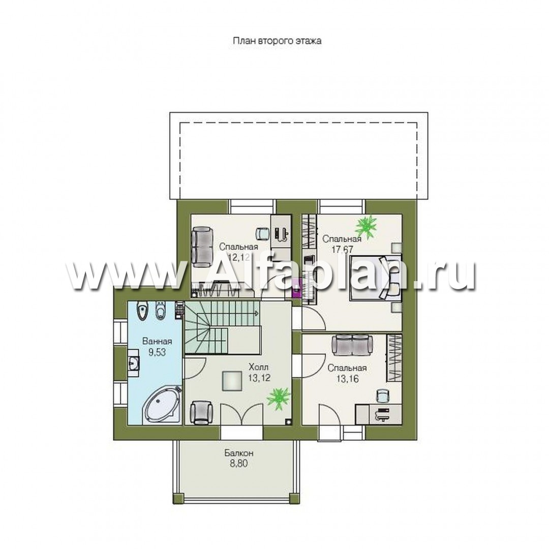 На втором этаже дома — целых три спальни, просторный холл на 13 м2, а также большая ванная, площадь которой составляет 9,5 м2. Из холла предусмотрен выход на балкон, площадью 8,8 м2.