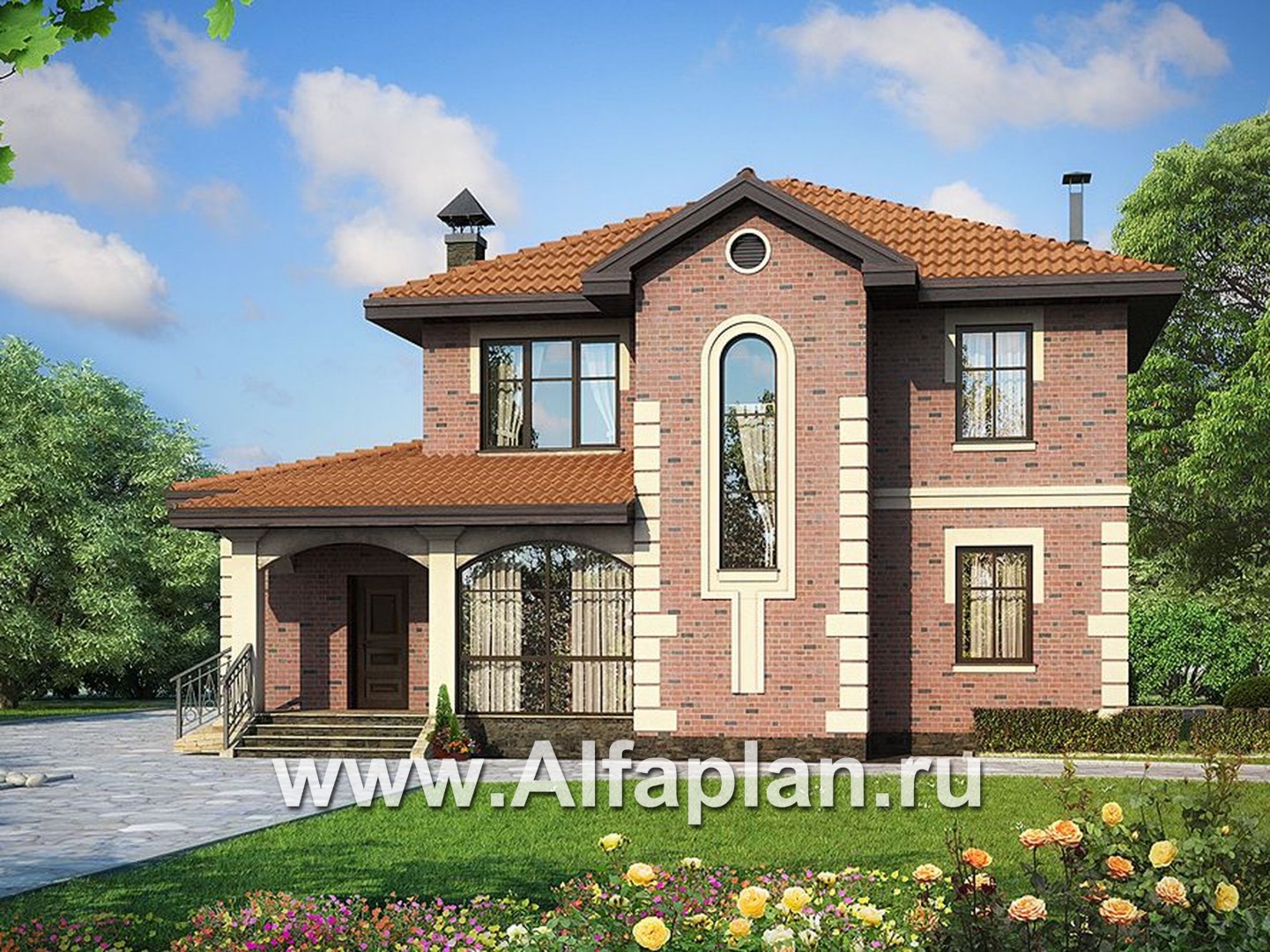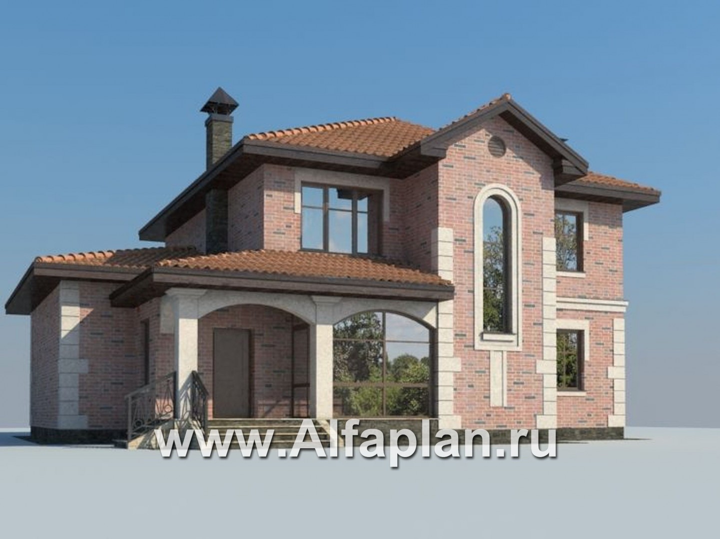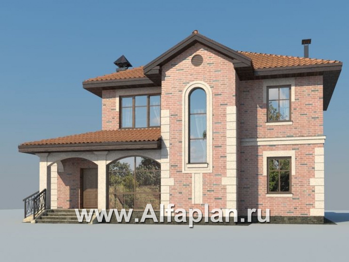 Проект под номером 439A назван классическим коттеджем с современной планировкой в реальности все качества данного жилья будут полностью соответствовать такой характеристике. Наружная отделка дома и архитектура придерживаются более строгой, хоть и не лишенной изящества классики стиля. Отделочный кирпич наружных стен обеспечит строгость и солидность цветов и очертаний, а блочная отделка углов, арочные окна фасадного эркера и крыльца, а также облицовочный камень цоколя придают немного классической яркости. Особенно хорошо подчеркивает удачный облик коттеджа большая застекленная арка фасадного крыльца, которая по канону классического стиля может изнутри сопровождаться шторами и горшками с декоративными растениями. Также удачным элементом этого дома является небольшая лоджия первого этажа, расположенная под общей кровлей и терраса первого этажа, выходящая на задний двор. Что же насчет материалов, предусмотренных для возведения наружных стен дома, то здесь имеется альтернативный вариант – можно использовать как газобетонные блоки, так и кирпич. Так что в отношении материалов наружных стен можно сказать следующее – здесь за счет строительной альтернативы коттедж можно отнести в спаренную рубрику «кирпичные и газобетонные дома».