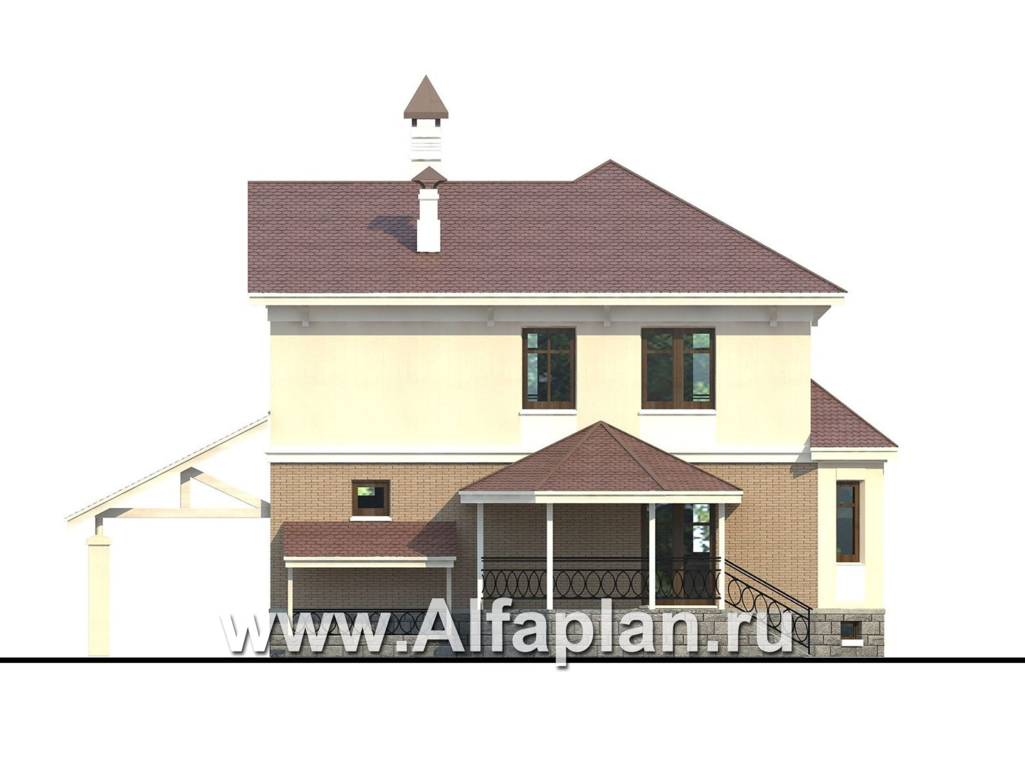Ширина этого дома без навеса для авто и без эркера столовой - 10м40см. От этих частей дома вы сможете при строительстве отказаться самостоятельно, тем более что навес гаража стоит на отдельном фундаменте.