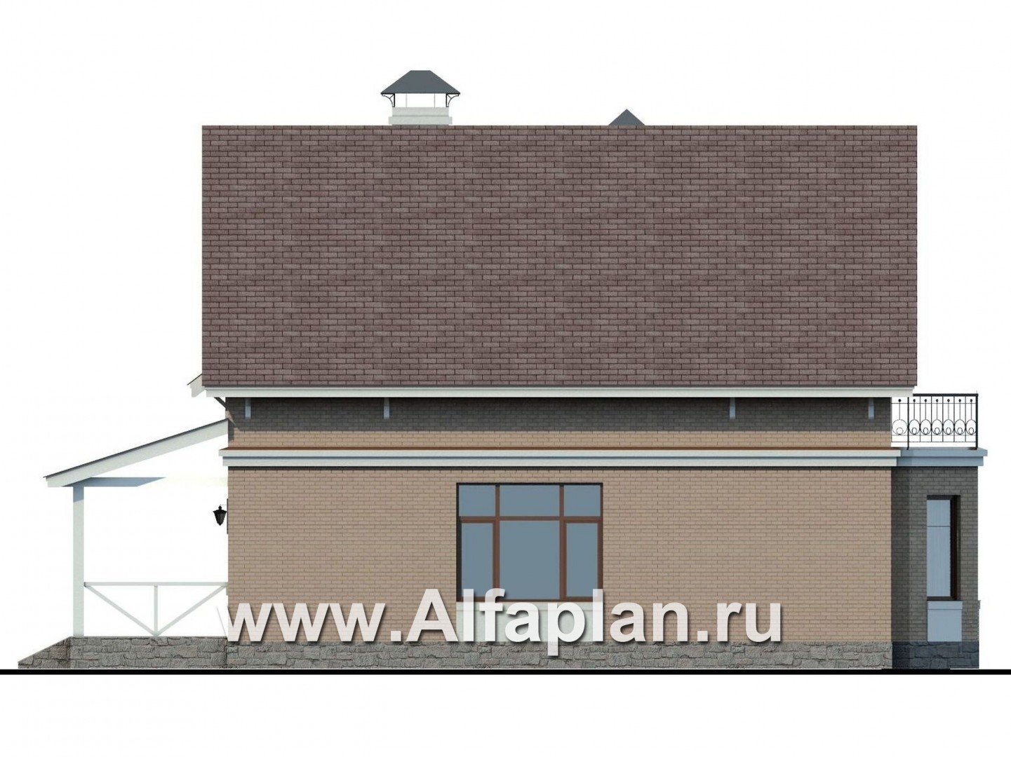 О таких домах говорят: «построен на века». Ощущение незыблемости и надежности вызывает и приземистый многогранный эркер, переходящий в балкон на втором этаже, и массивные колонны прямоугольного сечения, оформляющие центральный вход. Цветовая гамма – спокойная, выдержанная в коричнево-бежевых тонах, не противоречит общей картине. Ну, а довершает образ дома-крепости многоярусная скатная кровля сложной формы, выполненная, согласно этому проекту дома, из битумной черепицы.