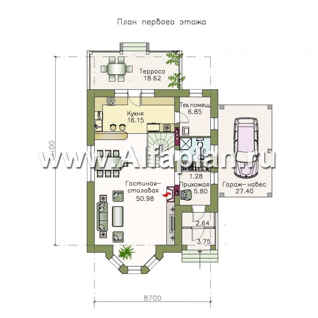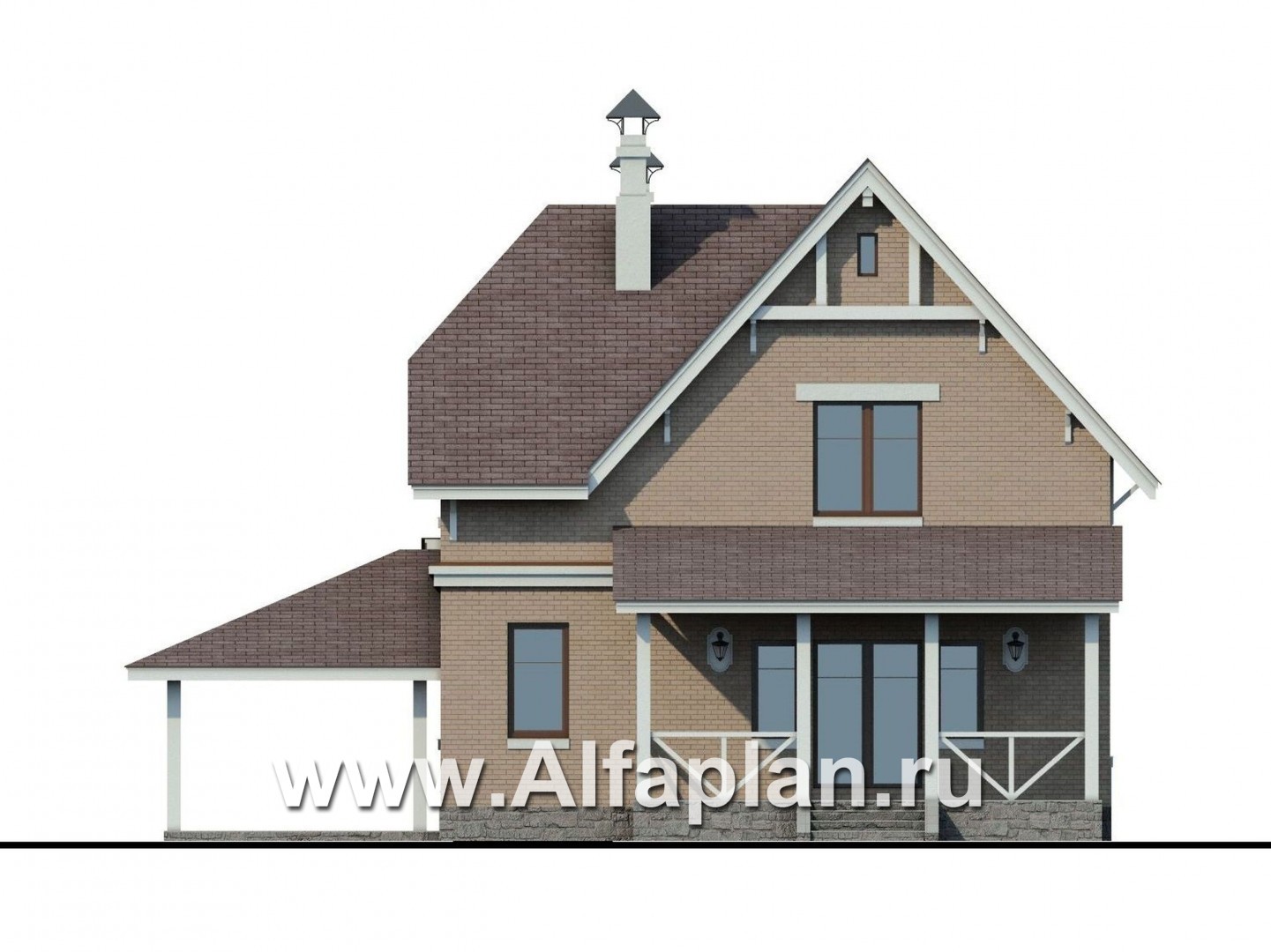 Дом снабжен навесом для одного автомобиля – это популярная сегодня альтернатива дорогостоящим теплым гаражам. Еще одно пристроенное помещение – открытая терраса, имеющая выход во двор.