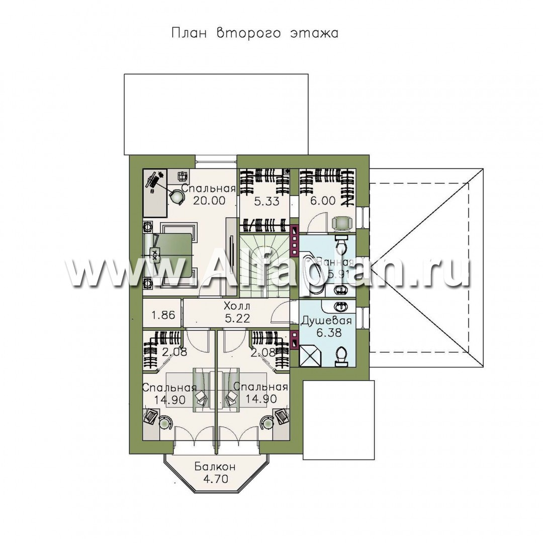 Второй этаж целиком отдан под помещения приватной зоны. Это просторная родительская спальня, снабженная двумя гардеробными и отдельным санузлом, а также две смежные детские комнаты, выходящие на общий балкон. Все спальни вместе с общей душевой группируются вокруг небольшого холла