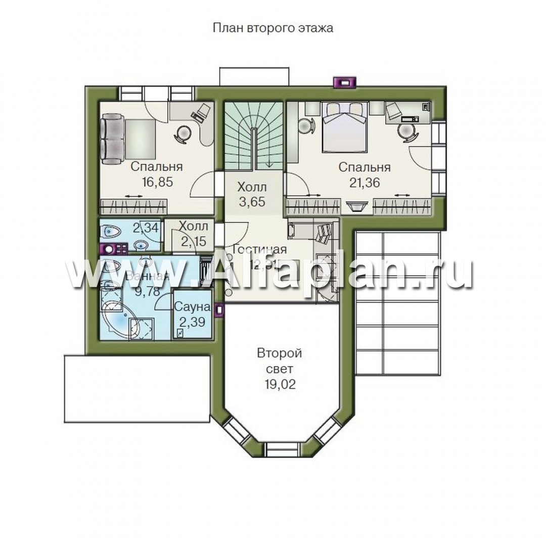Облик дома формирует эркер главного фасада. В нем расположено основное помещение дома - великолепная двусветная гостиная. С лестничным холлом она объединена в одно помещение. Кухня в проекте решена как изолированное помещение, но при желании от перегородок можно отказаться и получить единое гостевое пространство. Удобно расположение зимнего сада между кухней и гостиной. Кабинет может использоваться как комната для старших членов семьи или гостевая. Также на первом этаже, выйдя в холл из кабинета, можно пройти в прихожую и через нее попасть в дверь технического помещения/прачечной, также в санузел. Далее прихожая ведет во входной блок, объединяющий тамбур и крыльцо. Центром планировки второго этажа является гостиная. Это вторая, приватная гостиная дома. На этом же этаже находятся две спальни, санузел и просторная ванная комната. Ее площадь позволяет разместить даже небольшую сауну.