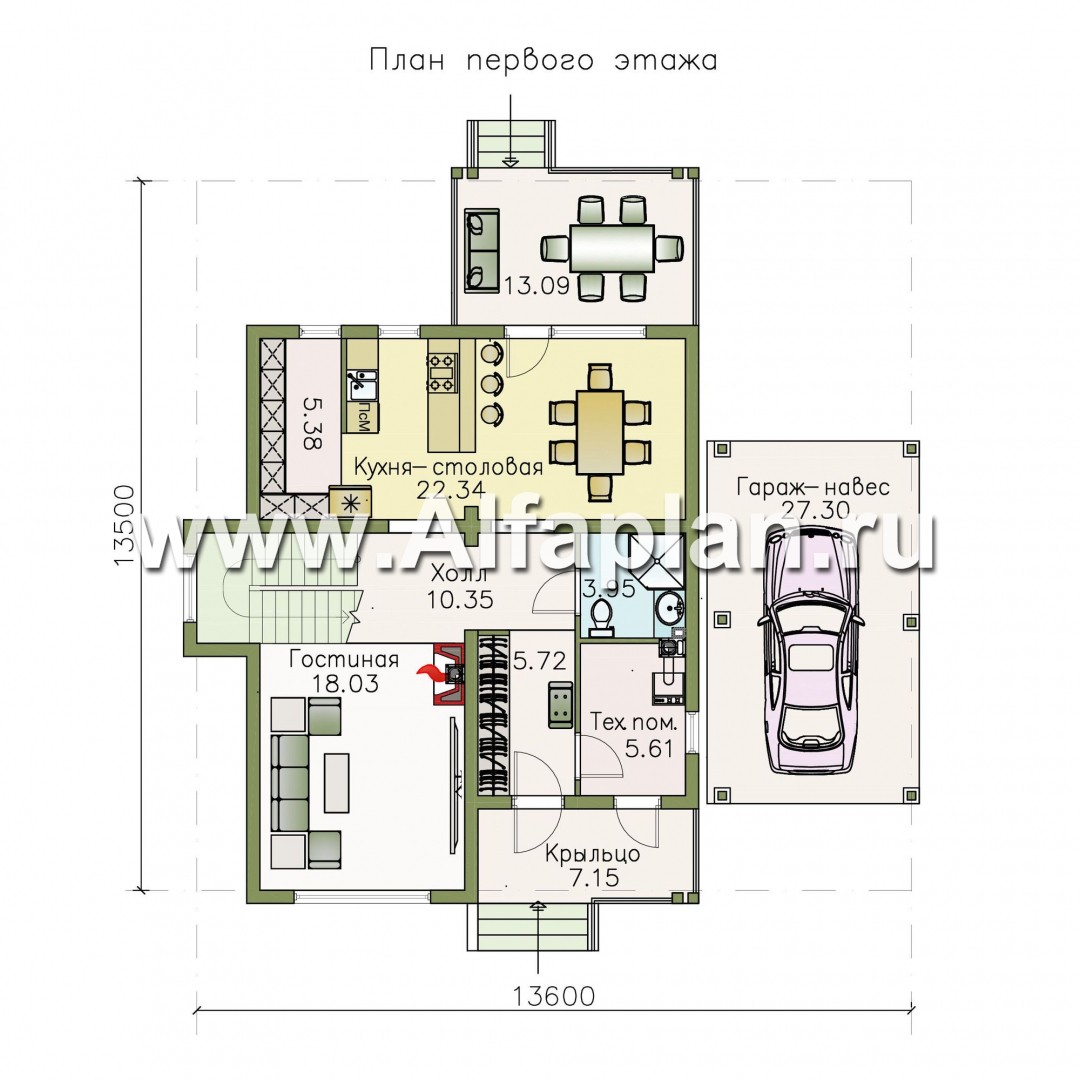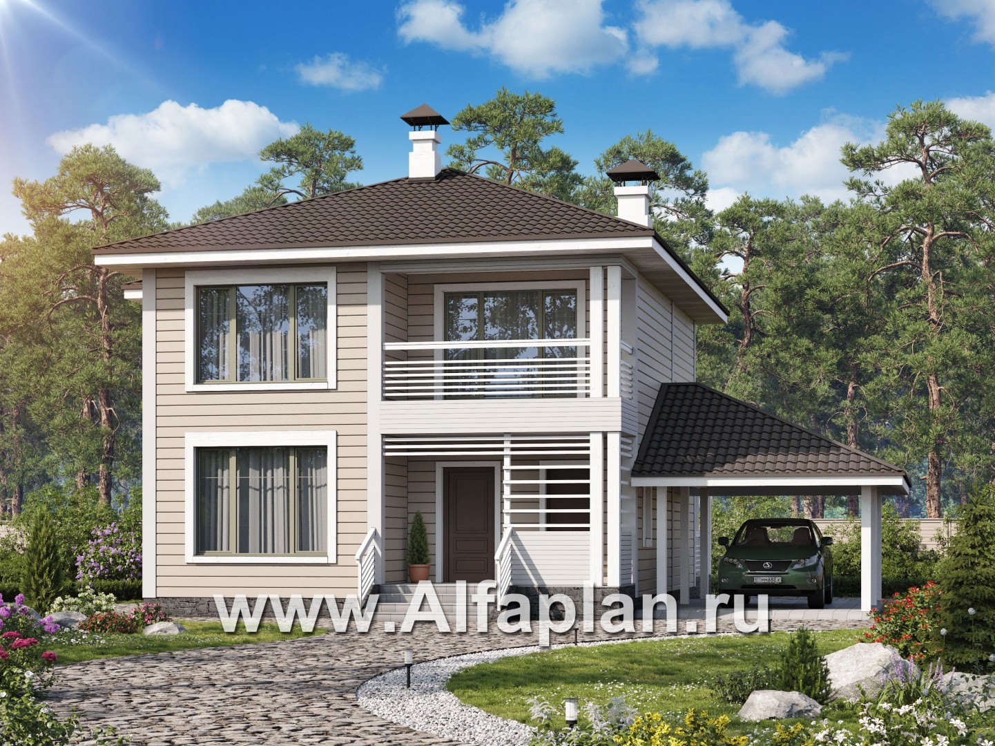 «АльфаВУД» - проект двухэтажного дома из дерева, из клееного бруса, с навесом для авто - технические характеристики