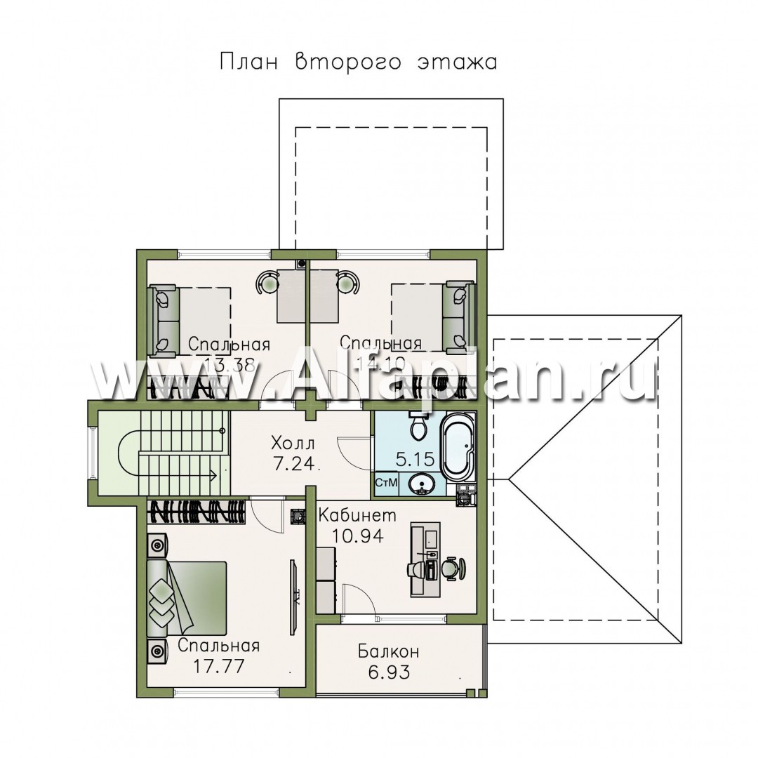 На втором этаже – четыре спальных комнаты и ванная. Из кабинета предусмотрен выход на балкон.