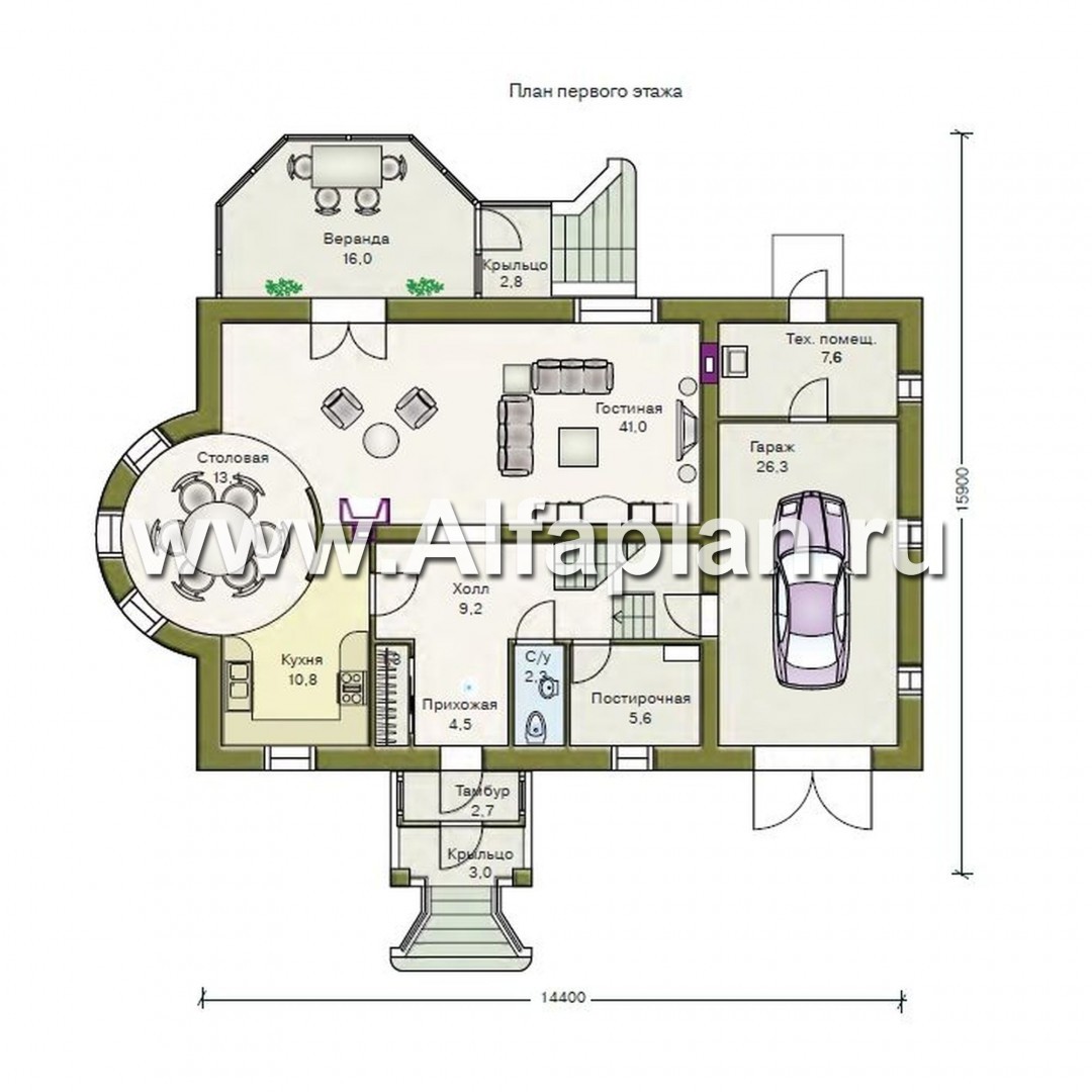 Веранда с крыльцом находится с противоположной стороны от главного входа.  Светлая столовая полукруглой формы площадью 13 м² совмещена с гостиной и компактной 10-метровой кухней. Здесь же на первом этаже есть гараж площадью 26 м², небольшая постирочная, техническое помещение и санузел.