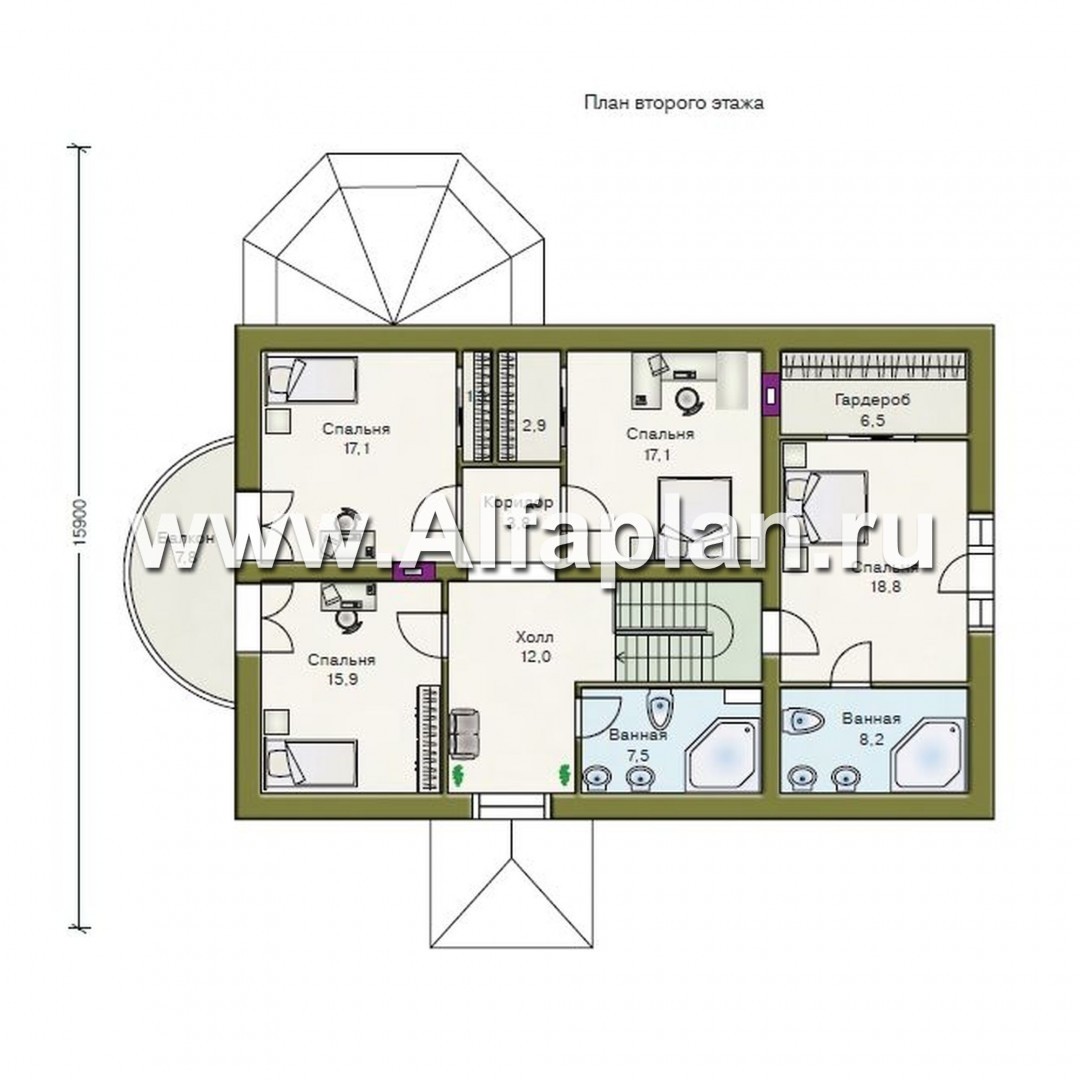 Второй пролёт лестницы ведёт в 12-метровый холл второго этажа. Детали подчёркивают единство стиля — окно арочной формы располагается прямо напротив арки. Через неё можно попасть в небольшой коридор и в спальни площадью по 17 м². В каждой спальне небольшие гардеробные. В одной из спален выход на балкон полукруглой формы площадью 8 м².