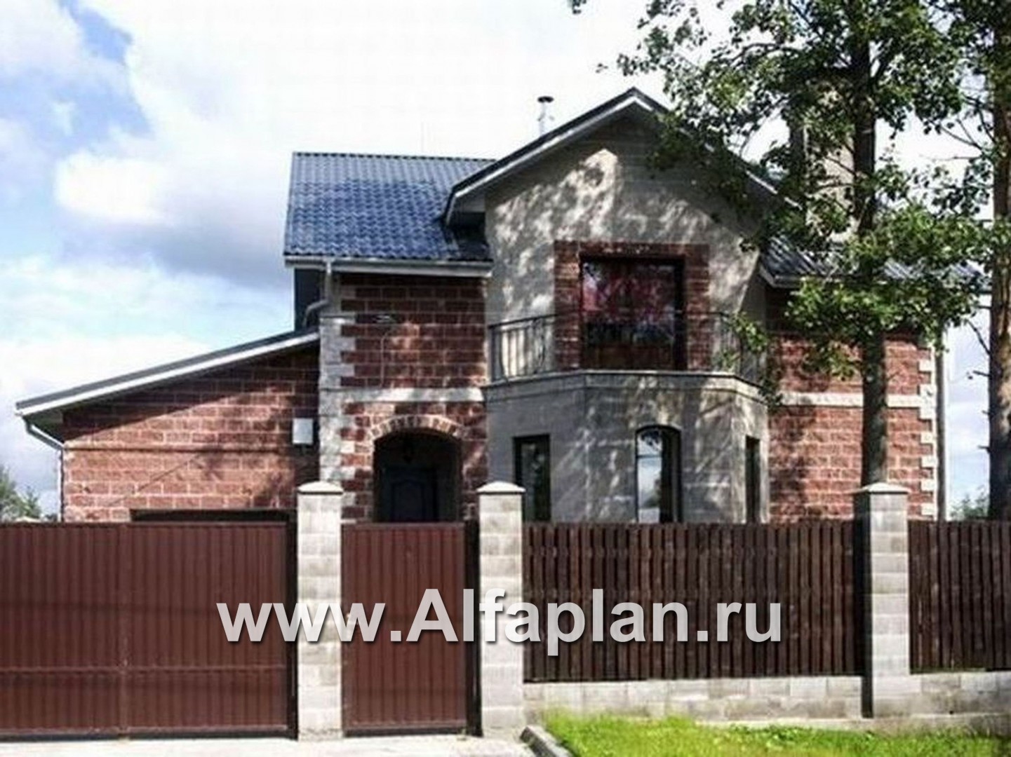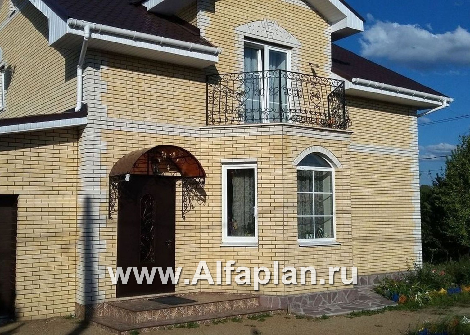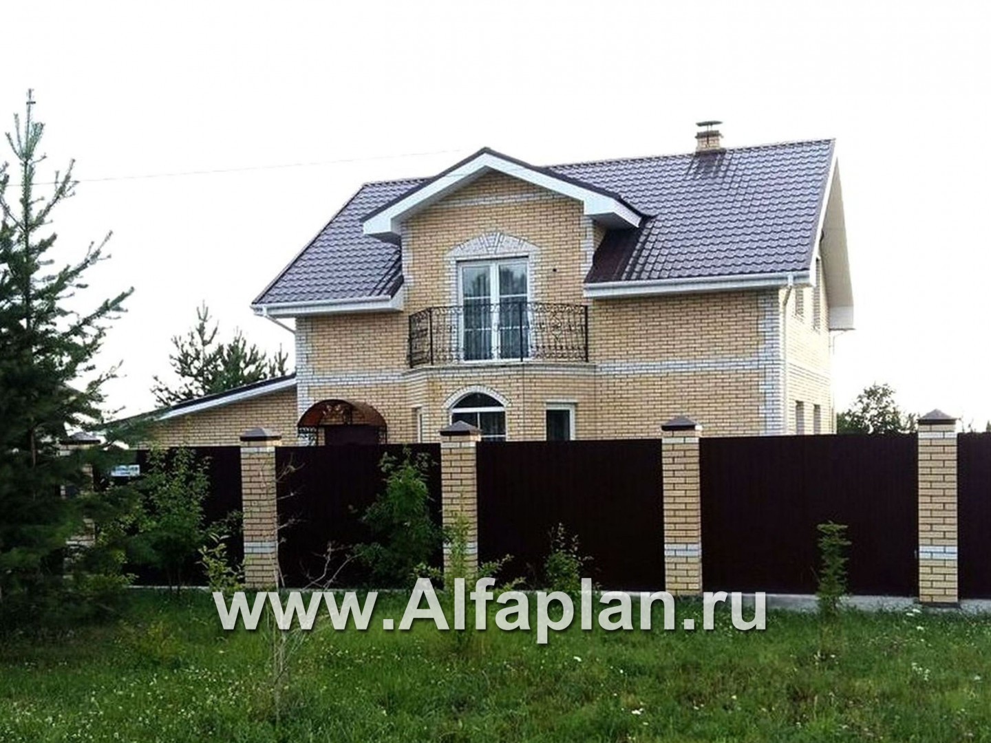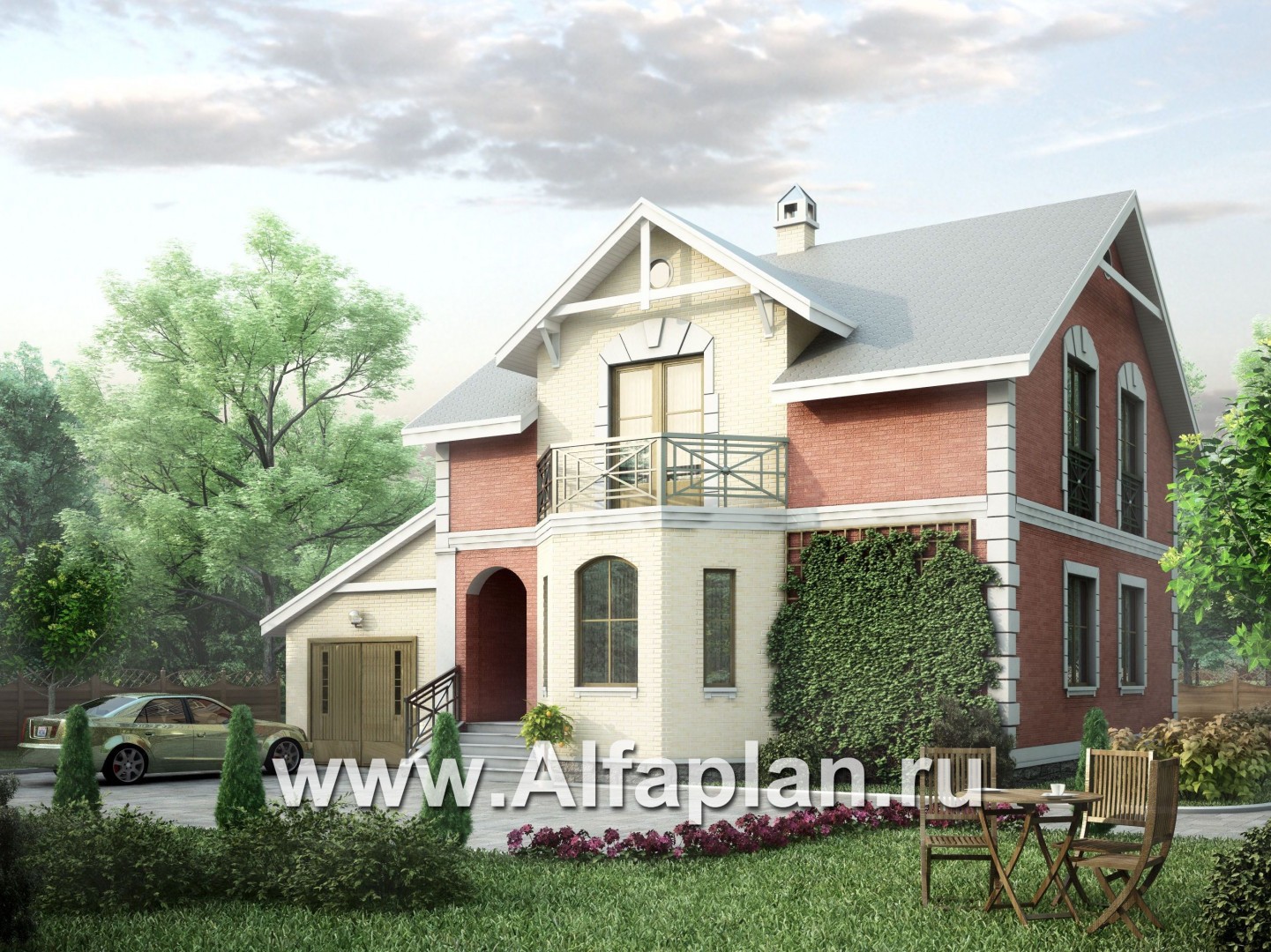 В этом доме есть все, что нужно для комфортной жизни, но при этом нет ничего лишнего, что приводило бы к неоправданным затратам. Сбалансированность комфорта и экономичности, рациональности и красоты - вот принципы, заложенные в проект. По внешнему виду это образец классического загородного коттеджа. Небольшой эркер, который выделен светлым облицовочным кирпичом, не только прибавляет площади, но и придает дому изысканный вид. Светлый кирпич также применен в отделке гаража. Кирпич или газобетон заложены в конструкцию наружных стен. Поэтому этот проект можно отнести и к кирпичным домам и к домам из газобетона.