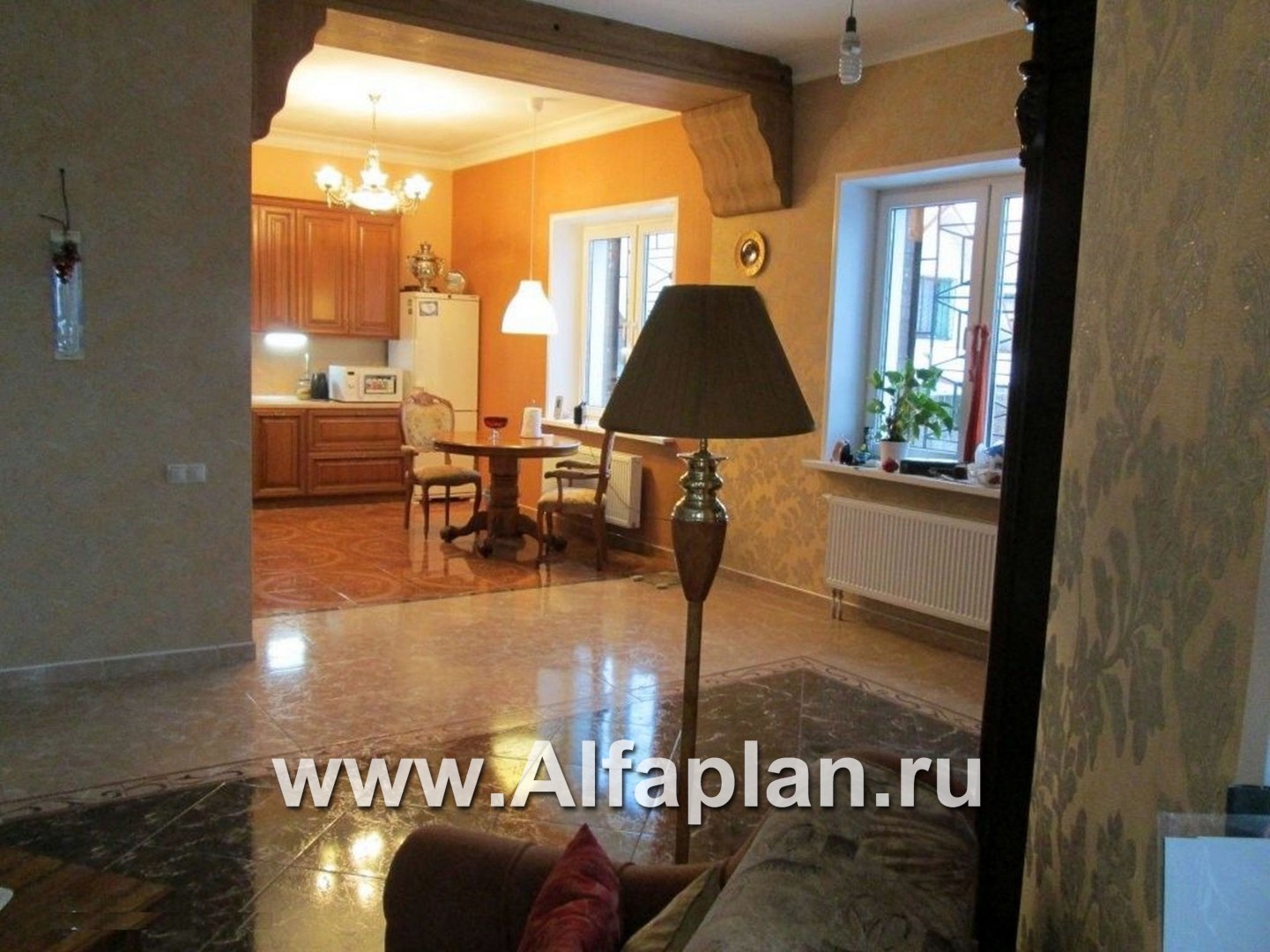 По проекту, для наружных стен дома применяется белый кирпич, который удачно подчеркивает красоту высоких окон, обрамляет углы дома и разделяет его этажи. На входной блок включает в себя прихожую, лестницу, техническое помещение и туалет. Из холла, через прихожую и тамбур есть выход на крыльцо глвногго фасада дома. Гараж располагается по торцевой стене дома и имеет связь с домом через техническое помещение. Наличие в здании двух входов обеспечивает дополнительное удобство проживающих. Гостиная предназначена для общения членов семьи и для приема гостей, ее интерьер обогащен эркером и камином. Она связана со столовой и с кухней широким проемом. Такая структура - с перетекающими друг в друга пространствами - не только создает ощущение простора и свободы, но и просто очень удобна.