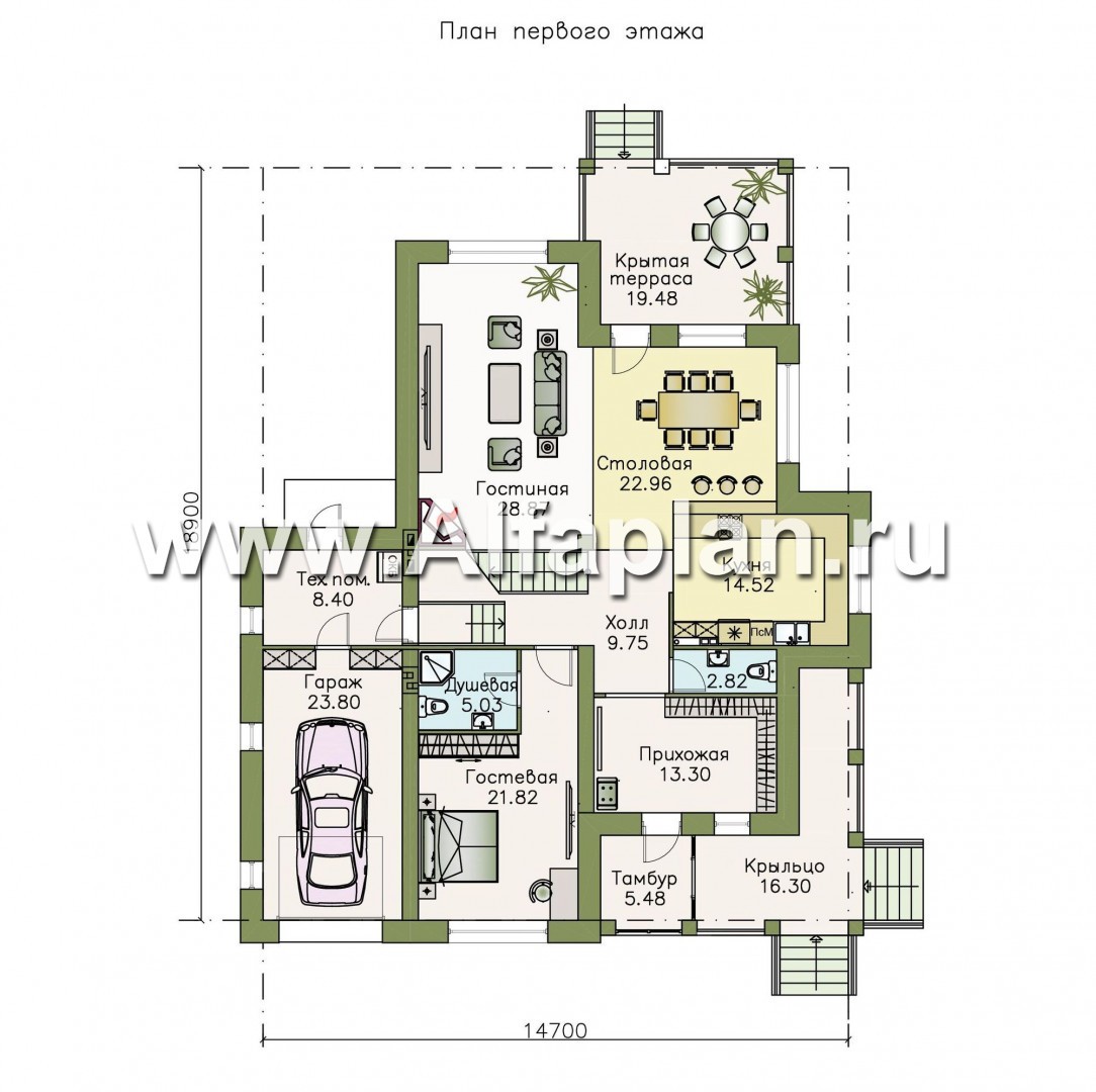 • холл с лестницей, один марш которой ведет в техническое помещение, смежное с гаражом, а другой поднимается на второй этаж;