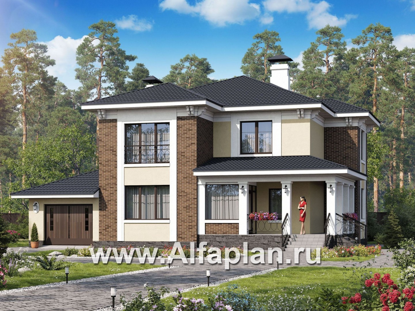 Дом исполнен в теплых пастельно-коричневых тонах, это придает ему спокойное очарование семейного жилья. Темная вальмовая черепичная кровля с белоснежной окантовкой венчает фасады, в отделке которых гармонично сочетаются кофейный облицовочный кирпич, светлая декоративная штукатурка и белизна колонн входной группы.