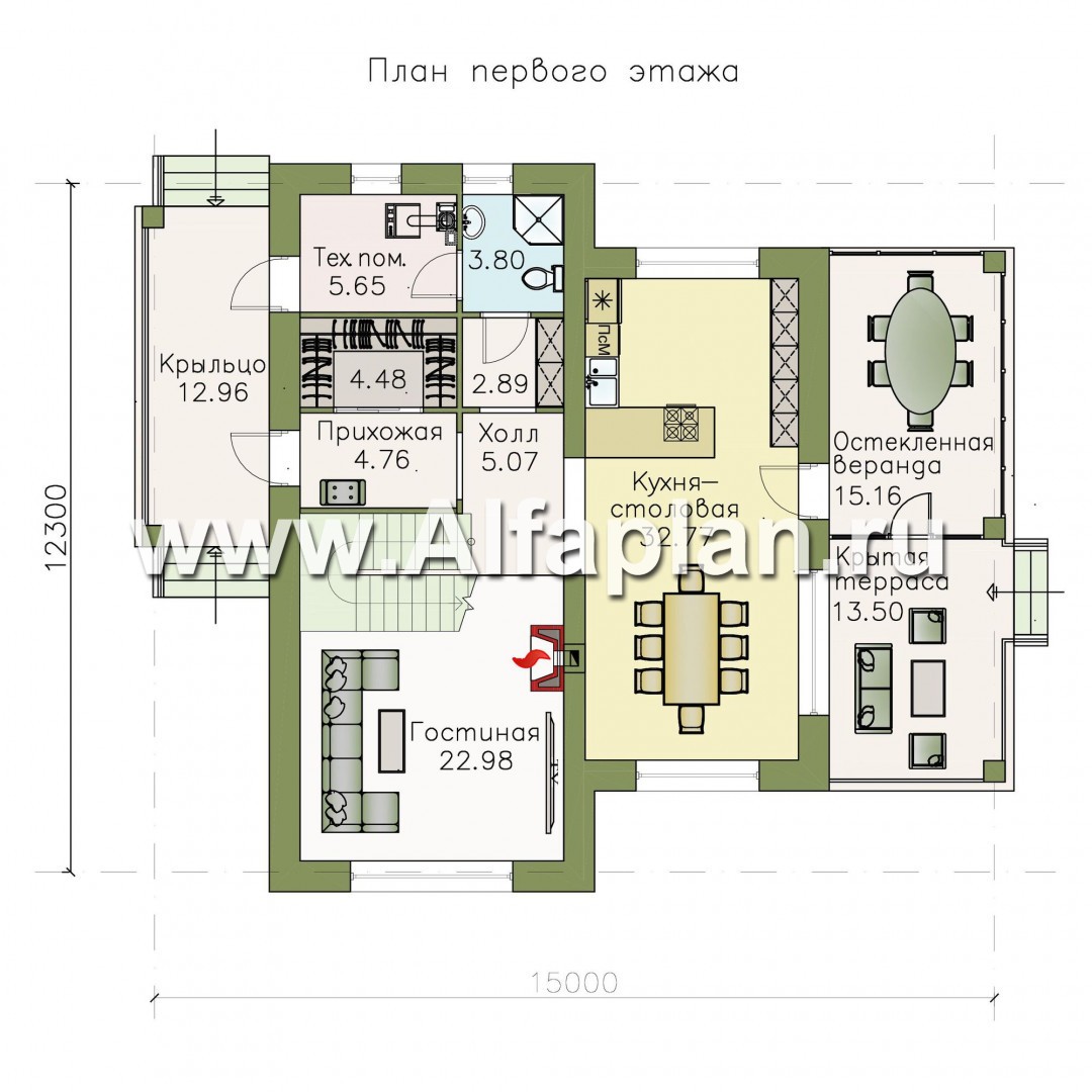 Двухэтажный проект дома из газобетона или кирпича оснащен всеми коммуникациями, имеет индивидуальное отопление (газовое), поэтому подходит как для сезонного, так и для постоянного проживания. Первый этаж коттеджа занимают общие помещения: огромная кухня-столовая, имеющая выходы на веранду и террасу, гостиная с камином (чуть меньше столовой) и маленький санузел, предусматривающий монтаж раковины и унитаза. К санузлу примыкает парилка, рассчитанная на одного человека. Здесь же расположено и техническое помещение (котельная), имеющее отдельный выход.