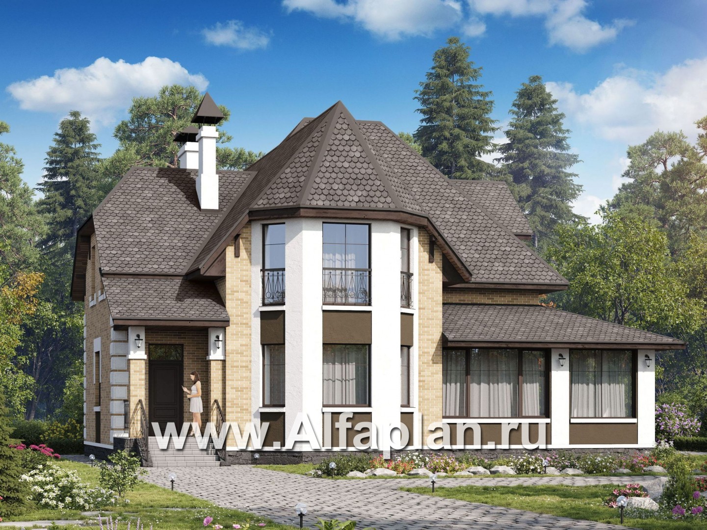 388A-S «Клио» - проект коттеджа с мансардой, с красивым эркером и с террасой, лестница в гостиной