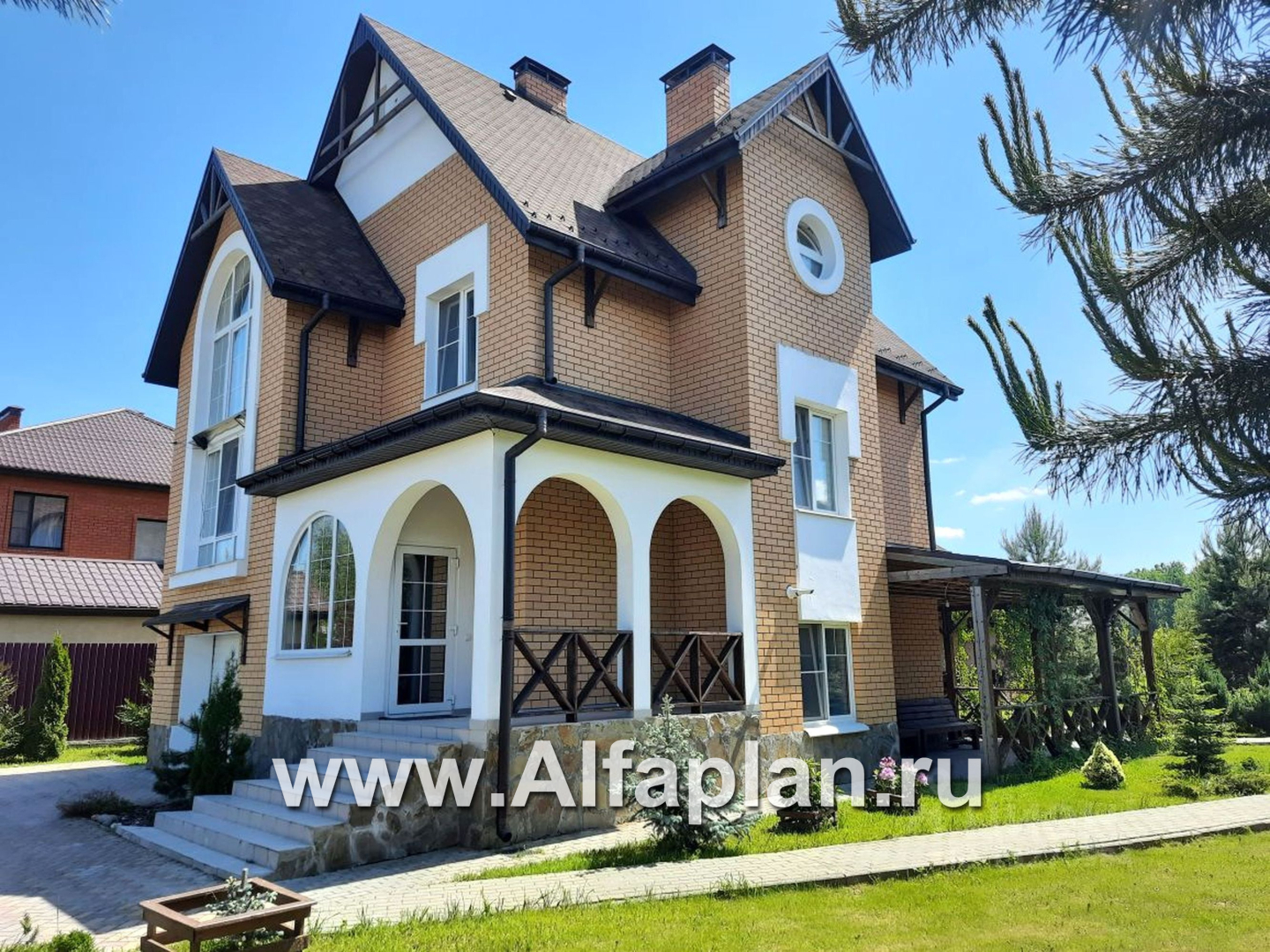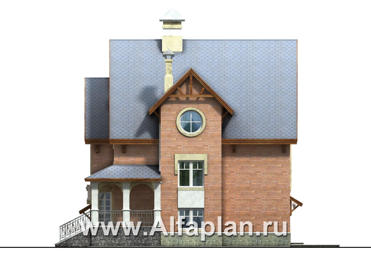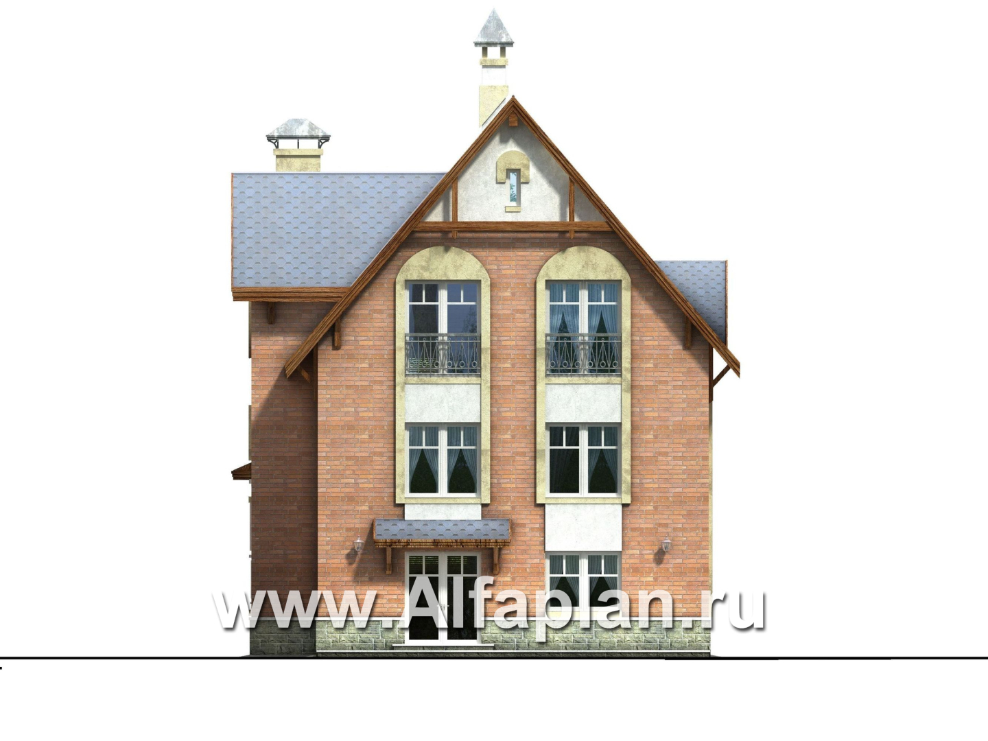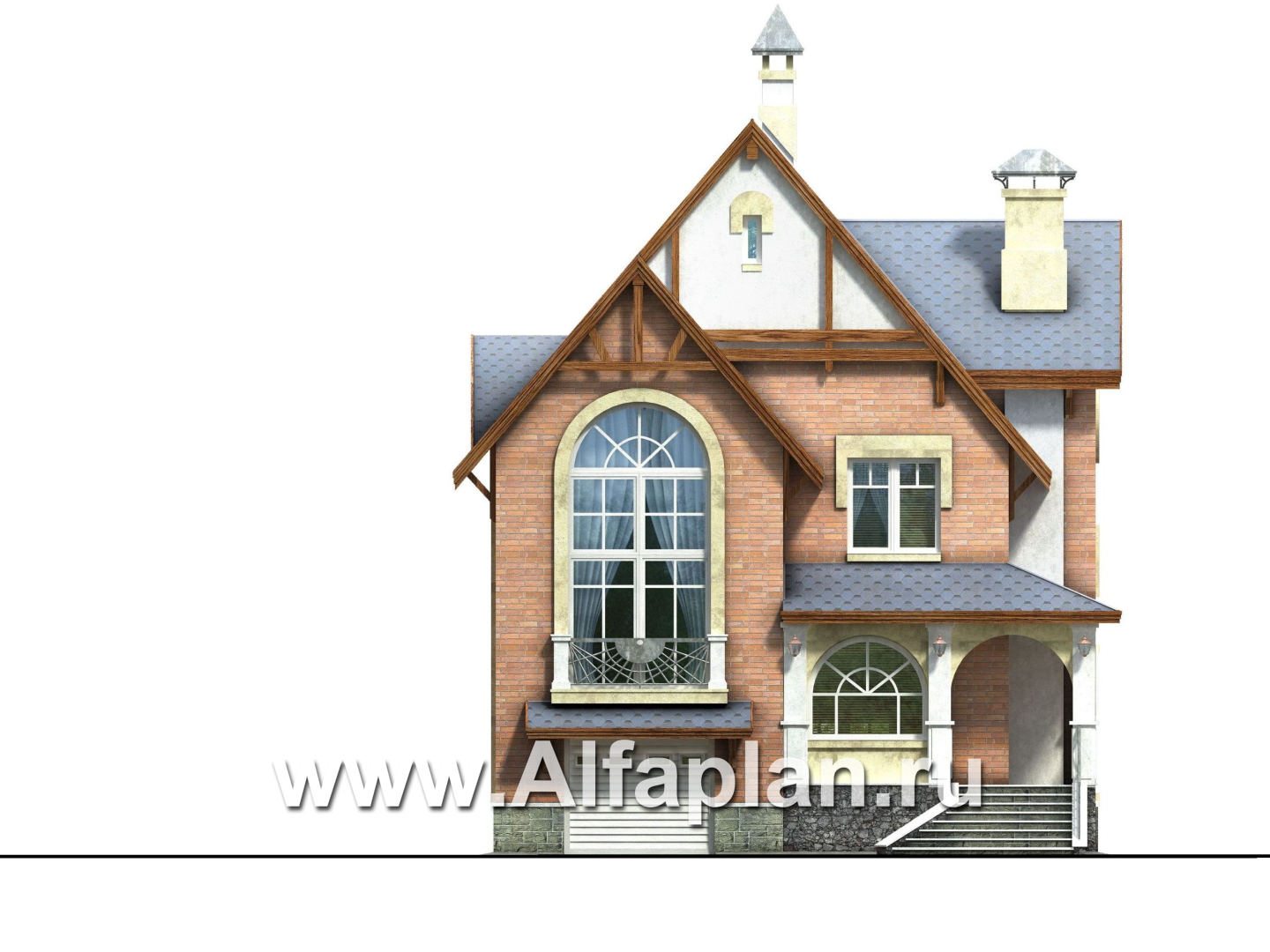 Вход в дом предваряет  крыльцо, обрамленное  колоннами  с арками и светлый остекленный тамбур. Прихожая расположена между цокольным и первым этажами. В ней имеется гардеробная и лестницы в цокольный этаж и на первый. Из холла цокольного этажа двери ведут в гараж, рядом находится техническое помещение и санузел. Большая площадь отведена под зону отдыха: она включает в себя душевую с тренажерами, сауну и комнату отдыха. Высота цокольного этажа 2,56м, а так как он выше уровня земли, то в нем есть естественное освещение.  Поднявшись в холл первого этажа, можем пройти в любое помещение. Слева от лестницы находится  удобная душевая, а рядом располагается кабинет (по усмотрению хозяев он также может служить спальной комнатой). В гостевую зону ведет широкий дверной проем.  Гостиная и кухня  разделены  перегородкой, при желании от нее можно отказаться. Второй свет в гостиной позволил получить красивый арочный витраж, французский балкон — изысканное к нему дополнение. Теплую и уютную атмосферу в гостиной дополняет камин.  Кабинет можно использовать  и как гостевую. В мансарде расположены две спальни, ванная комната и достаточно просторный, светлый холл.  В проект можно внести изменения, убрав зону второго света перекрытием, получив еще одну спальную комнату. Уютный, комфортный и очень симпатичный дом для жизни загородом. Проектом также учитывается объемное изображение коттеджа и его зеркальное изображение.