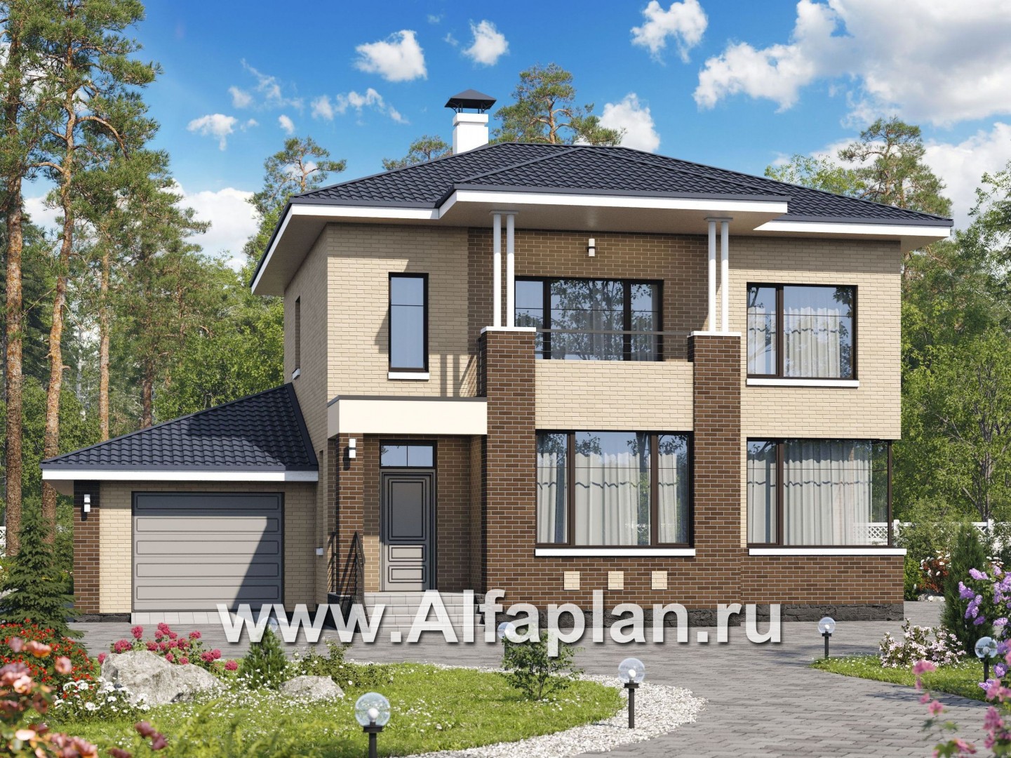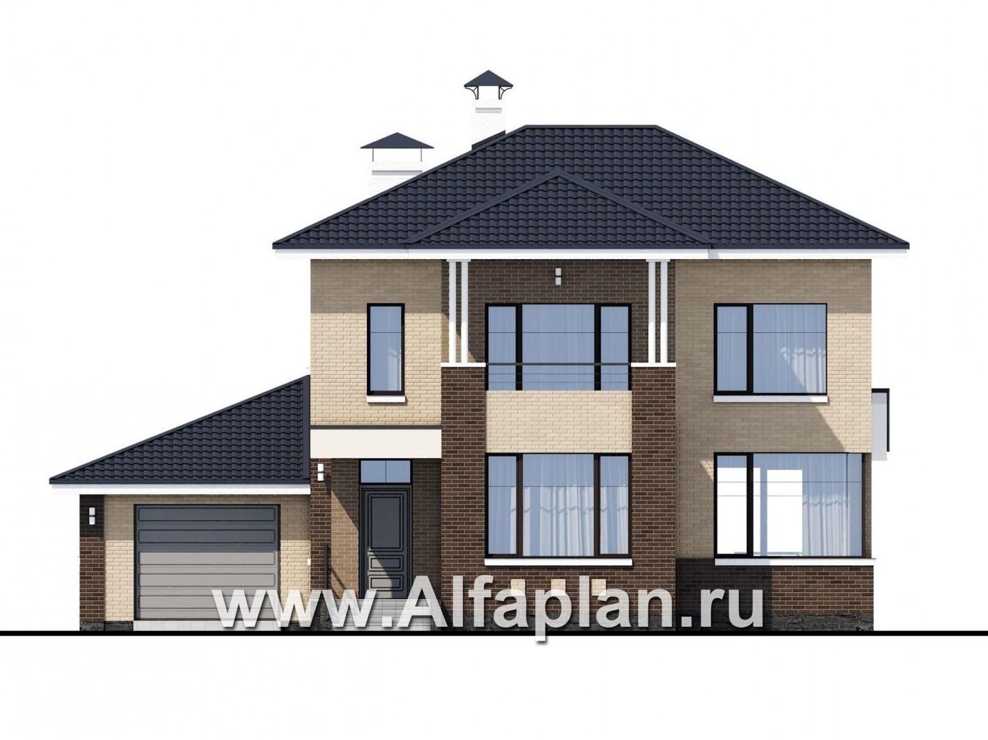 «Рефлекс» - современный проект двухэтажного дома из газобетона, с гаражом и террасой, фасад из кирпичей